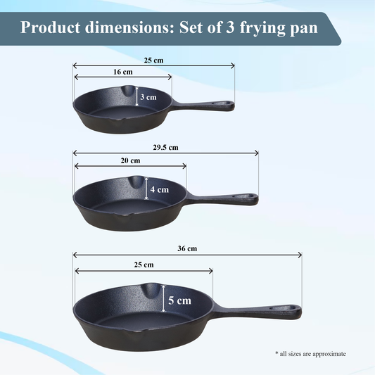 Buckingham Pre-Seasoned Cast Iron Skillet Set of 3 Frying Pan 16 cm, 20 cm & 25 cm