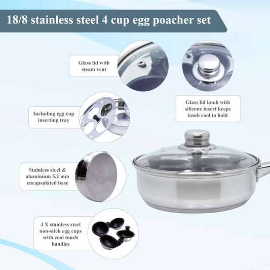 Buckingham Stainless Steel Egg Poacher Pan with Tempered Glass Lid 20 cm