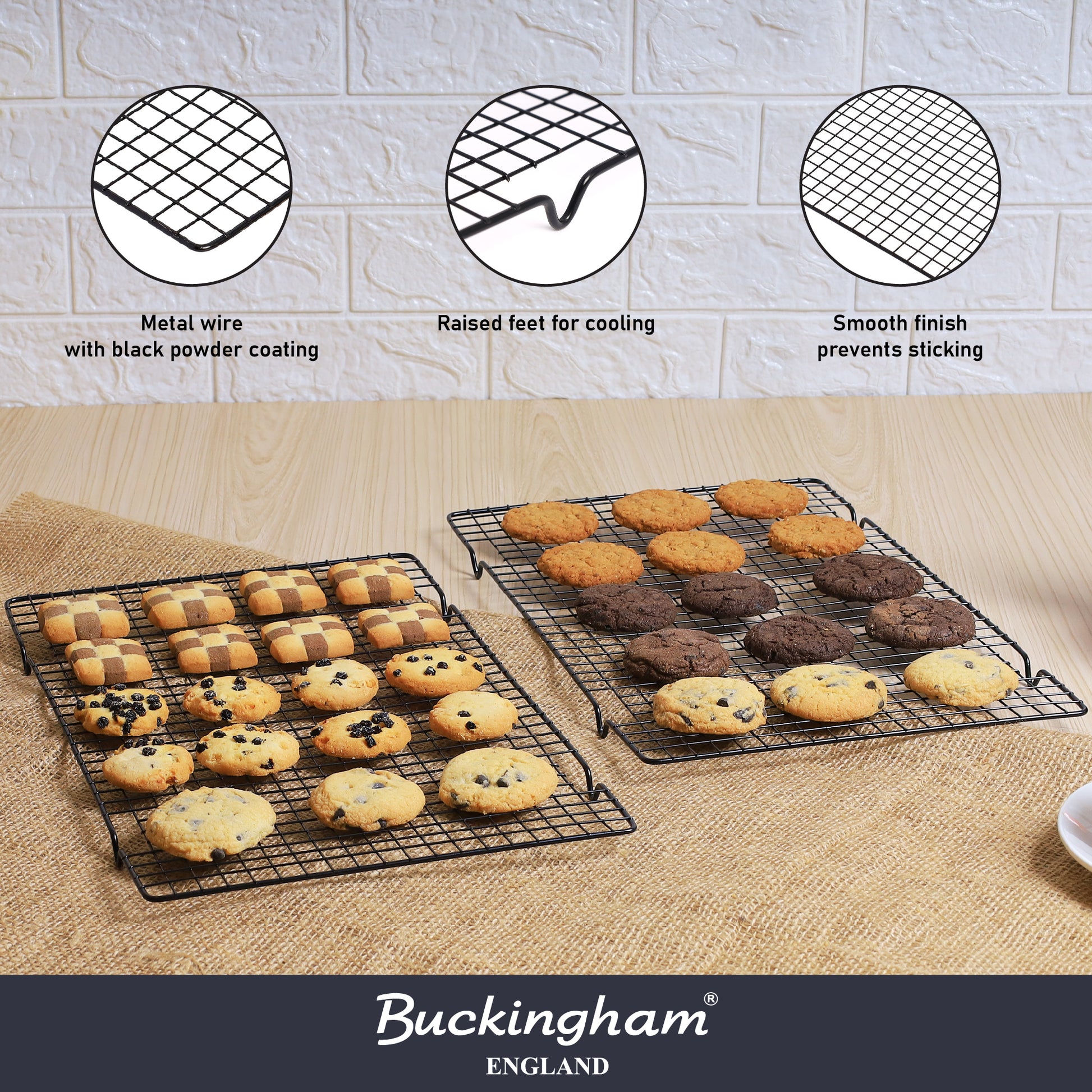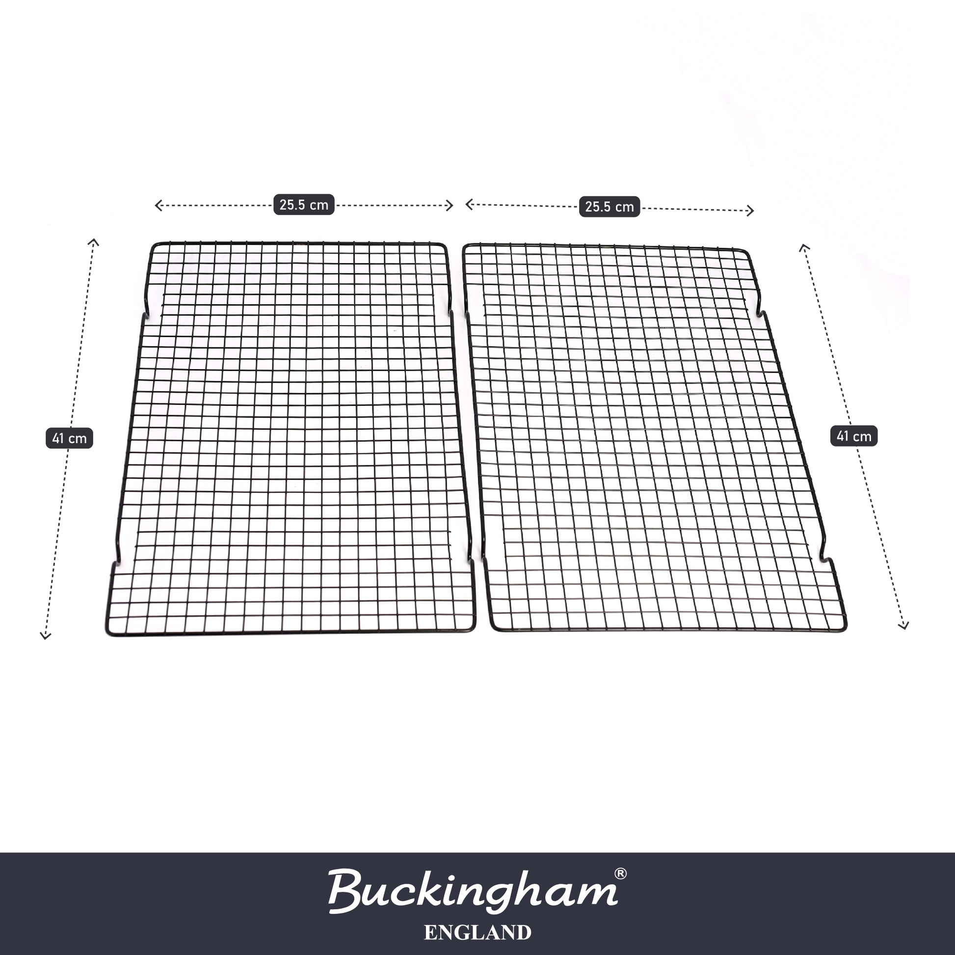 Buckingham Pack of 2 Cake Cooling Racks provides an efficient, durable solution for cooling all types of baked goods. Made from sturdy electrophoresis steel wire, each rack ensures even airflow with its raised feet, helping your bakes cool quickly and evenly. Our smooth, non-stick surface keeps delicate treats intact, while greaseproof paper can be used for added protection. Compact yet spacious, our racks measure 41 cm × 25.5 cm × 1.5 cm, perfect for fitting on most kitchen counters. Easy to clean and maintain, they’re a practical, must-have accessory for any baker
