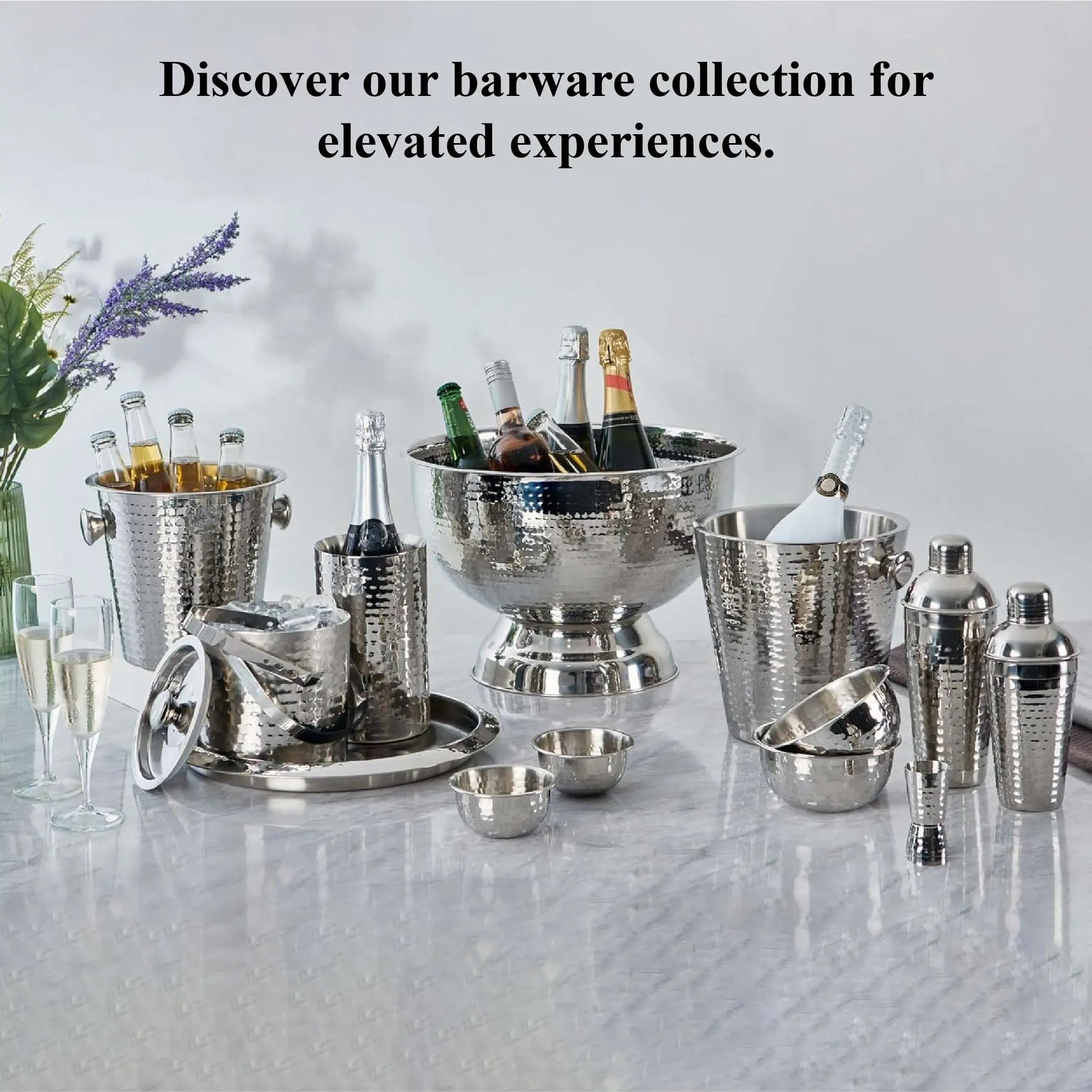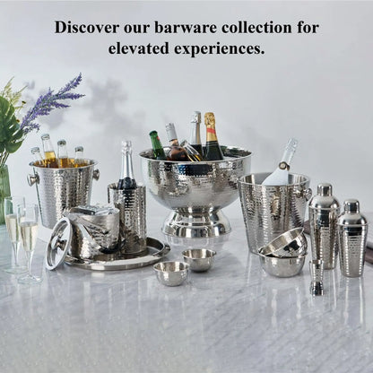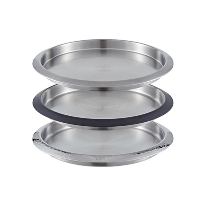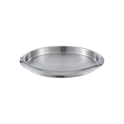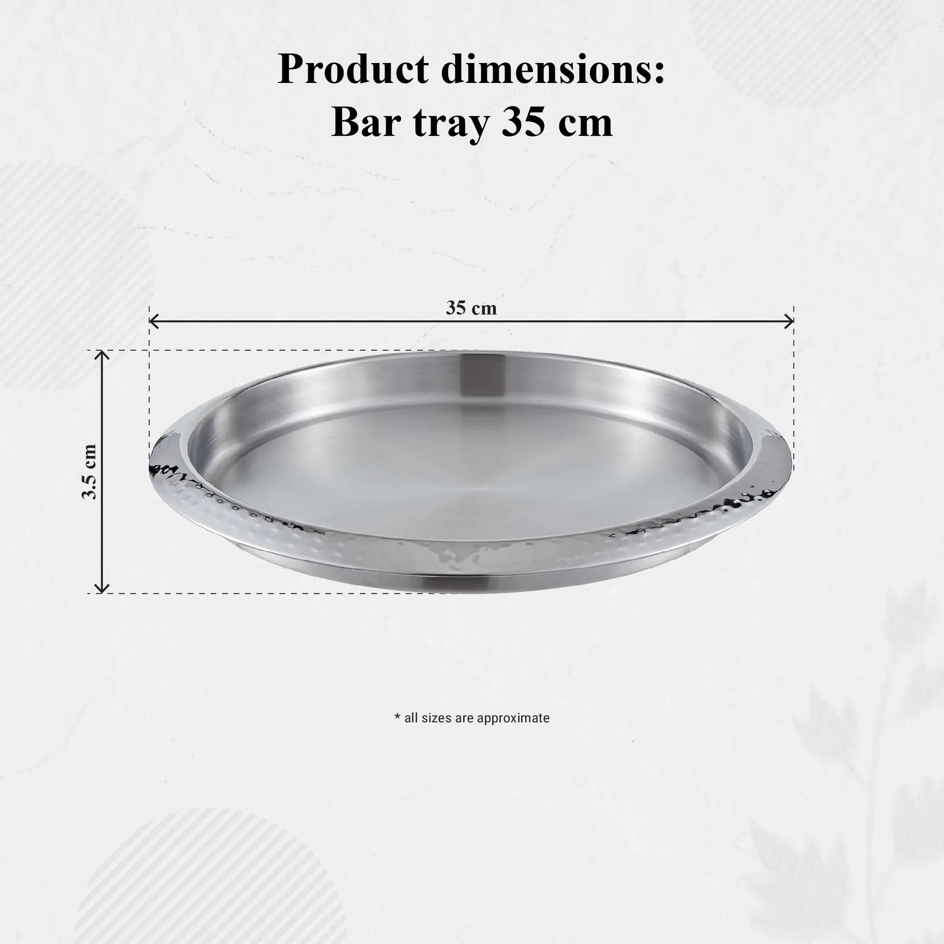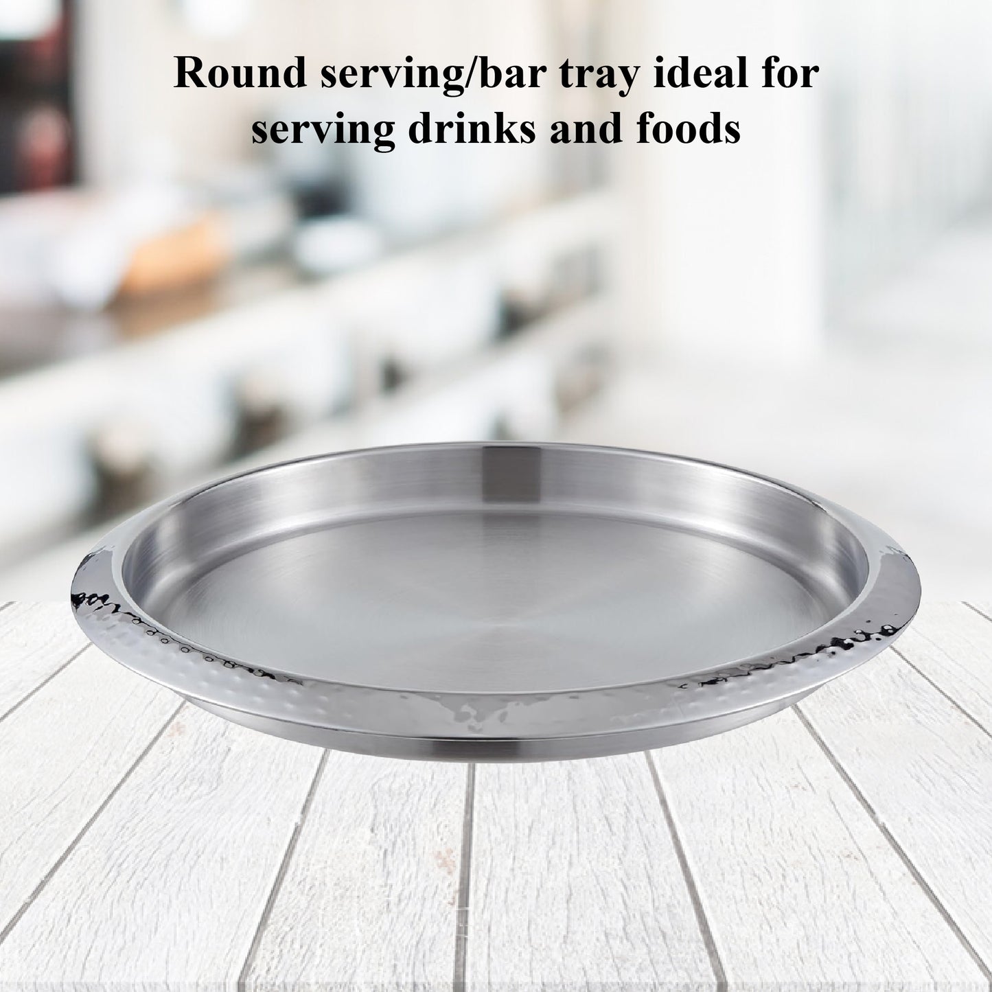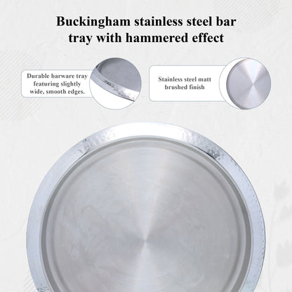 Buckingham stainless steel round serving/bar tray blends elegance with practicality, making it perfect for presenting drinks or food at any event. Our refined hammered border adds a touch of sophistication, while the high-quality stainless steel construction ensures durability and resistance to rust and tarnish. Our rolled edge provides a secure, comfortable grip for effortless serving. Suitable for both indoor and outdoor use, our tray is sturdy enough for regular entertaining. Measuring 35 cm in diameter and 3.5 cm high, it offers ample serving space without being bulky. For best care, hand washing is recommended to preserve its polished finish.
