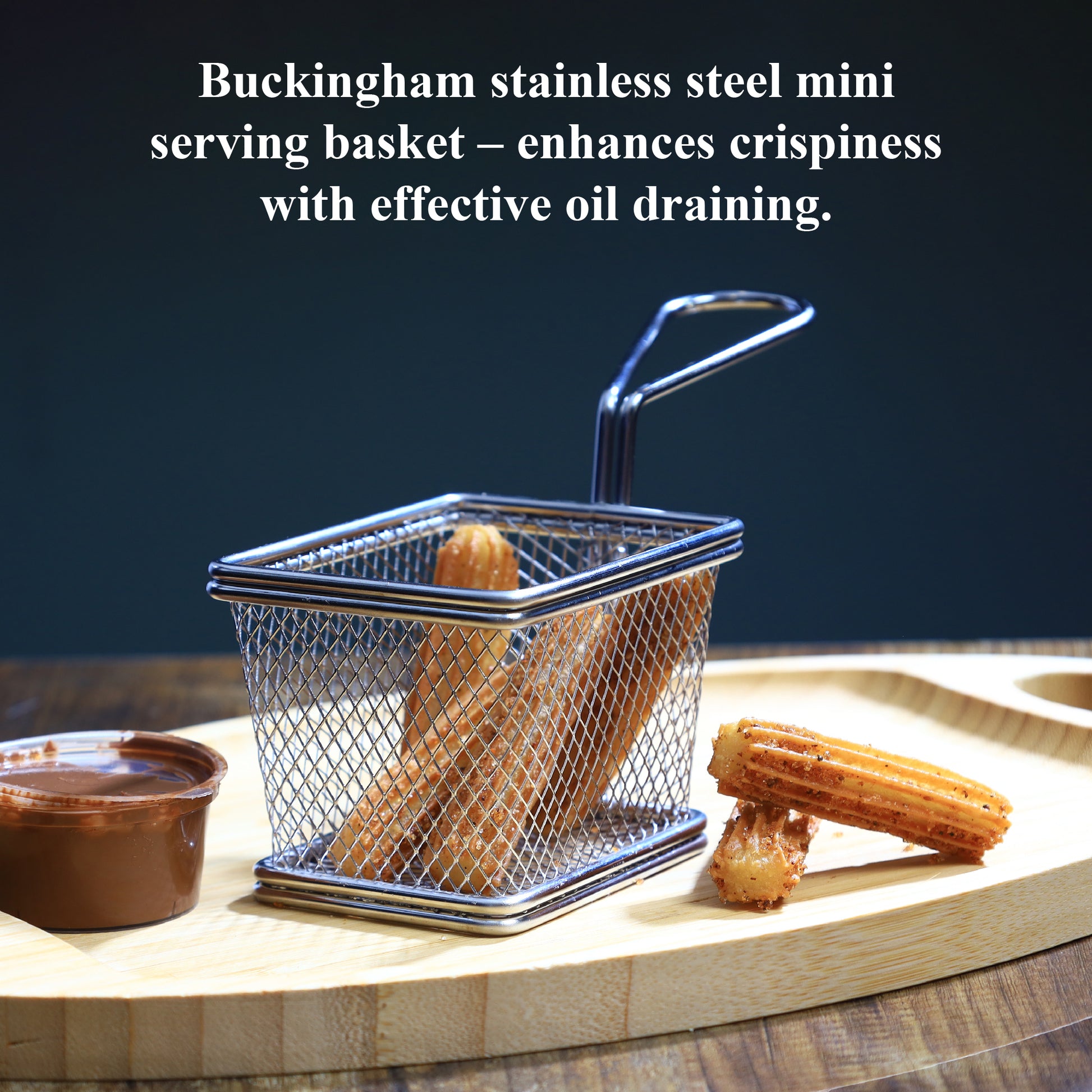 Buckingham rectangular mini serving basket add a modern touch to your table with our stainless steel serving basket. Featuring a polished finish and sturdy mesh design, it’s perfect for hot, crispy snacks like fries, onion rings, or appetizers. Measuring 10 × 8 × 7.5 cm, it offers ample space for small portions. The looped handle ensures easy serving, while the open mesh makes cleaning effortless. Ideal for both restaurants and home dining, it combines style with practicality.