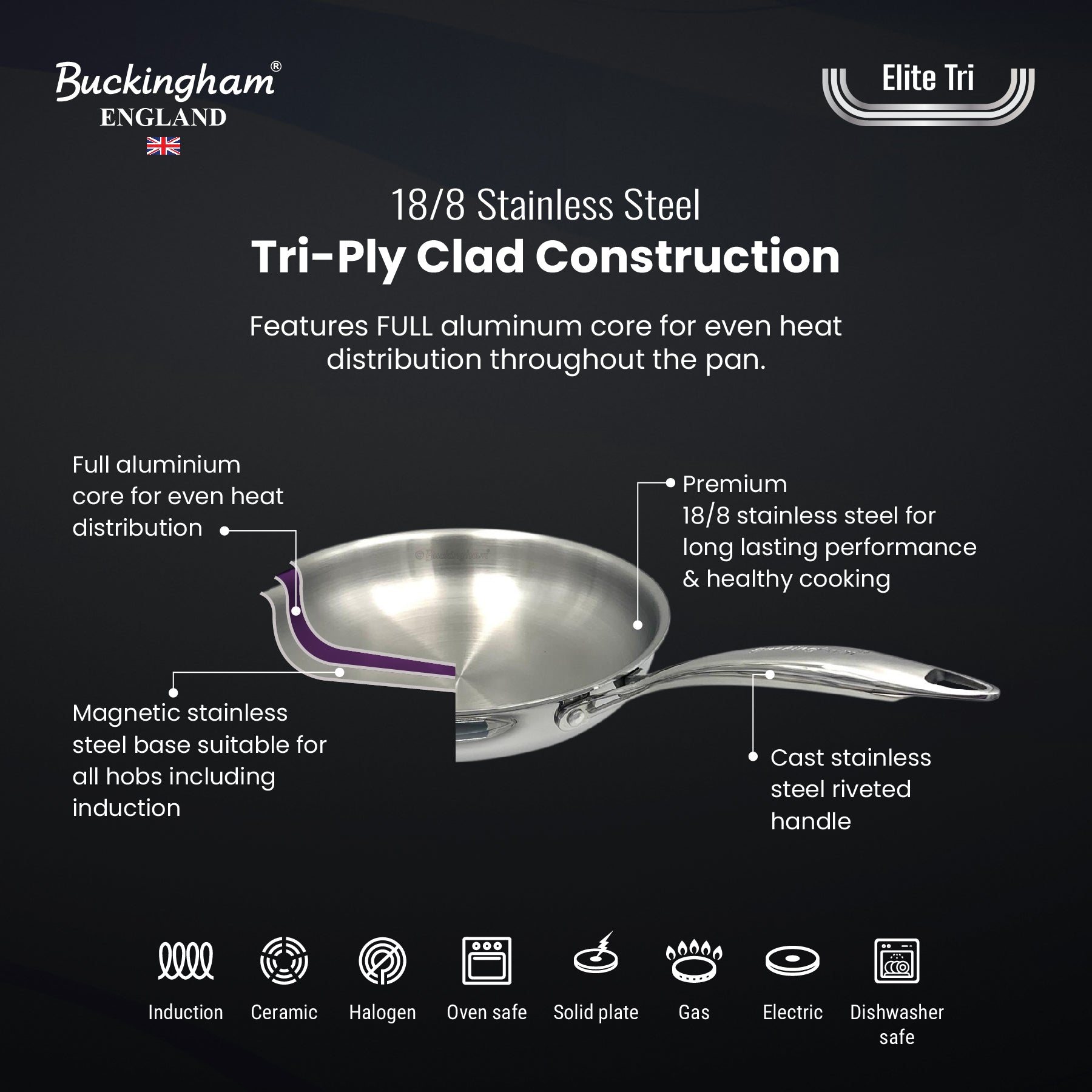 Buckingham Elite-Tri Stainless Steel set of 3 Frying Pan is made for precision and performance, featuring a elite-tri clad construction that combines an 18/8 stainless steel cooking surface, an full aluminum core for fast, even heating, and a magnetic 18/0 stainless steel base suitable for all stovetops including induction hobs. Our advanced heat surround technology ensures that heat is evenly distributed across the entire pan, preventing hot spots and promoting uniform energy efficient cooking. Free from PFAS and PTFE. Our set of 3 frying pans offer a healthier way to cook and are compatible with all stovetops, including induction and oven safe for added versatility. Our ergonomically designed stay-cool hollow riveted handle provides a safe, comfortable grip, while the seamless stainless steel surface allows for effortless easy hand washing and is dishwasher safe, making it a practical, long lasting and high-performing addition to any kitchen.