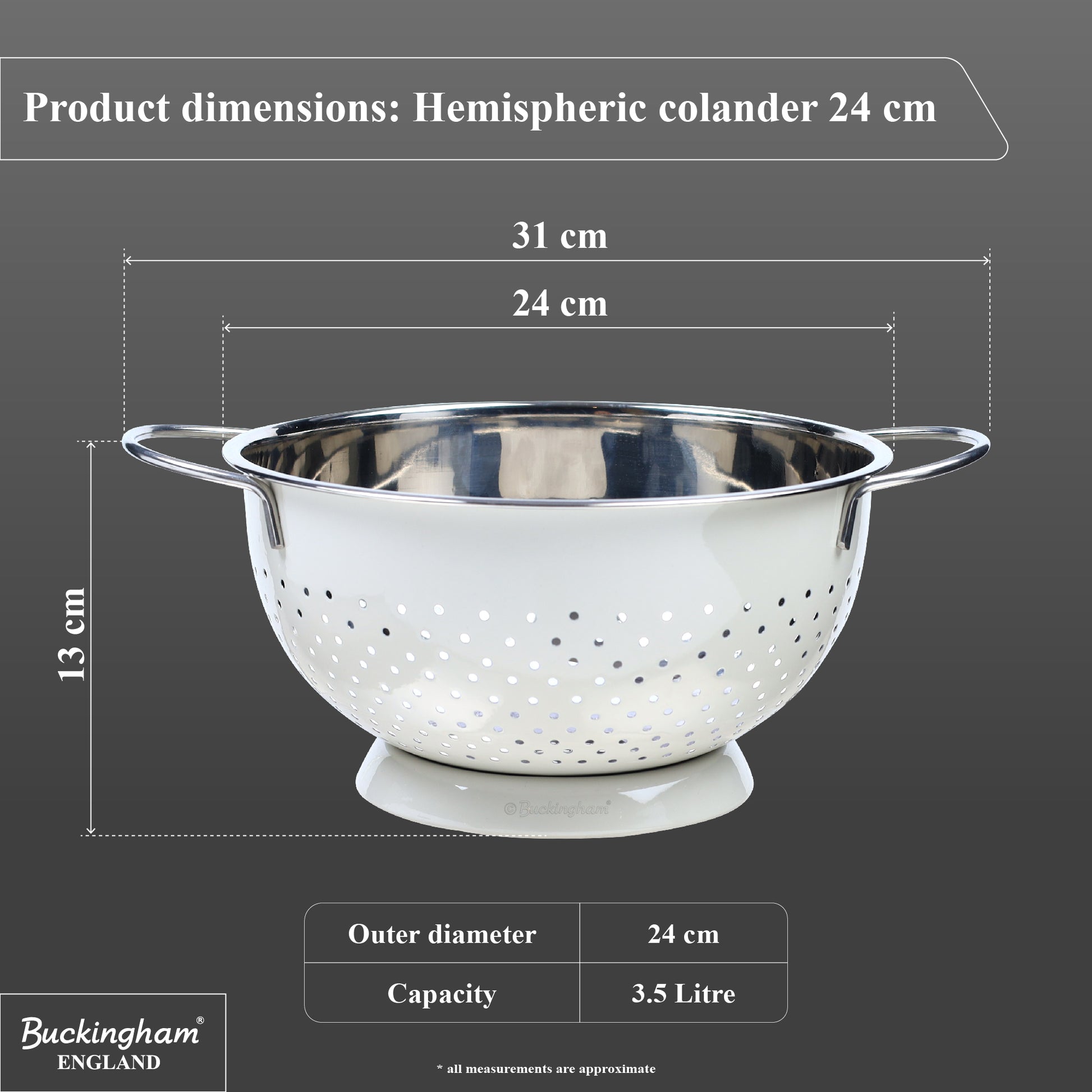 Buckingham Hemisphere Colander / Strainer is made from durable stainless steel with a sleek, refined finish to suit any kitchen style. Designed with fine, evenly spaced holes, it ensures efficient rinsing, draining, and sifting while keeping food securely inside. Sturdy ergonomic handles and a stable base provide ease of use, balance and convenient storage. Dishwasher-safe and odor-resistant, our colander offers hassle-free cleaning and long-lasting hygiene. Ideal for rinsing, draining pasta, steaming vegetables, or washing fruits, it combines everyday practicality with elegant design