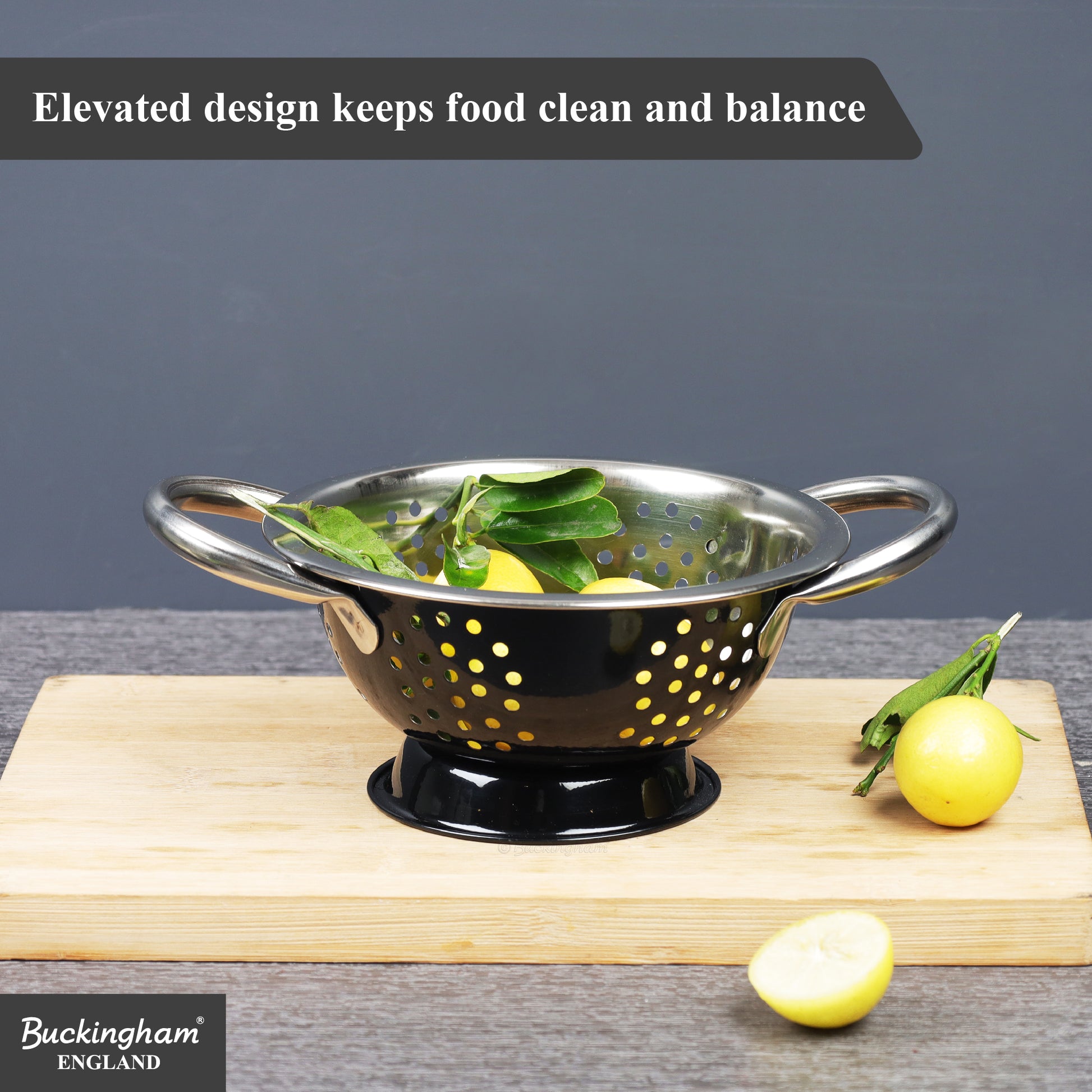 Buckingham Deep Colander is a compact yet versatile kitchen essential. Made from rust-resistant stainless steel with efficient perforations, a raised base, and ergonomic handles, it delivers quick draining, stability, and easy handling. Stylish and practical, it’s perfect for everyday food prep in any kitchen.