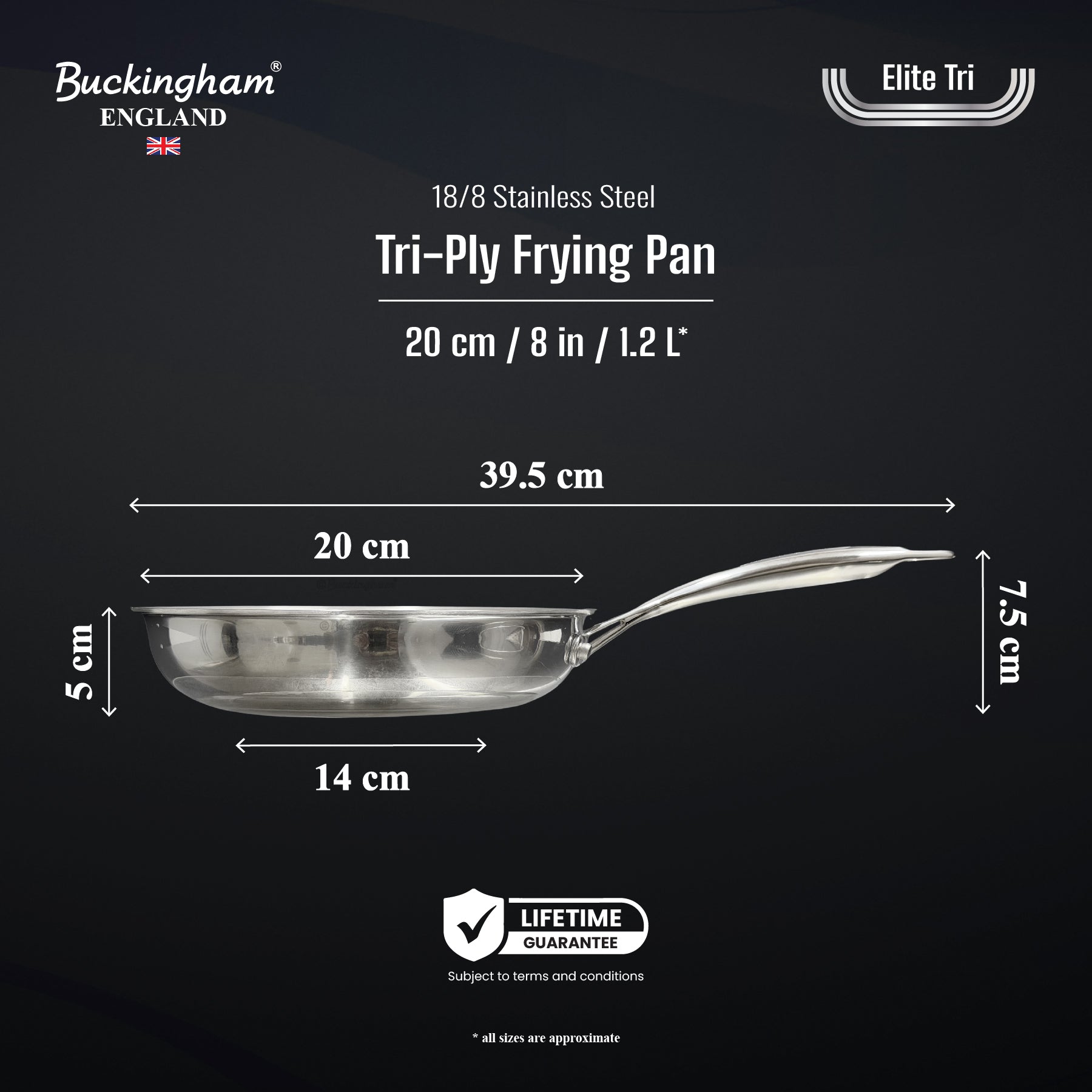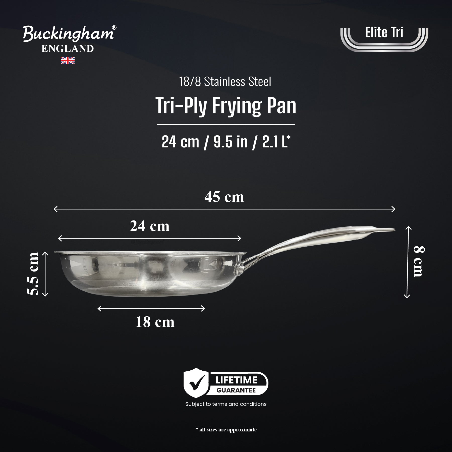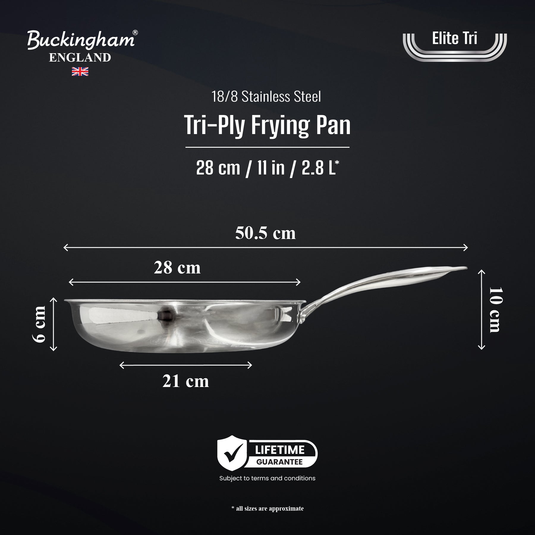 Buckingham Elite-Tri Stainless Steel Frying Pan is made for precision and performance, featuring a elite-tri clad construction that combines an 18/8 stainless steel cooking surface, an full aluminum core for fast, even heating, and a magnetic 18/0 stainless steel base suitable for all stovetops including induction hobs. Its advanced heat surround technology ensures that heat is evenly distributed across the entire pan, preventing hot spots and promoting uniform energy efficient cooking. Free from PFAS and PTFE. Our pans offer a healthier way to cook and are compatible with all stovetops, including induction and oven safe for added versatility. Our ergonomically designed stay-cool hollow riveted handle provides a safe, comfortable grip, while the seamless stainless steel surface allows for effortless easy hand washing and is dishwasher safe, making it a practical, long lasting and high-performing addition to any kitchen.