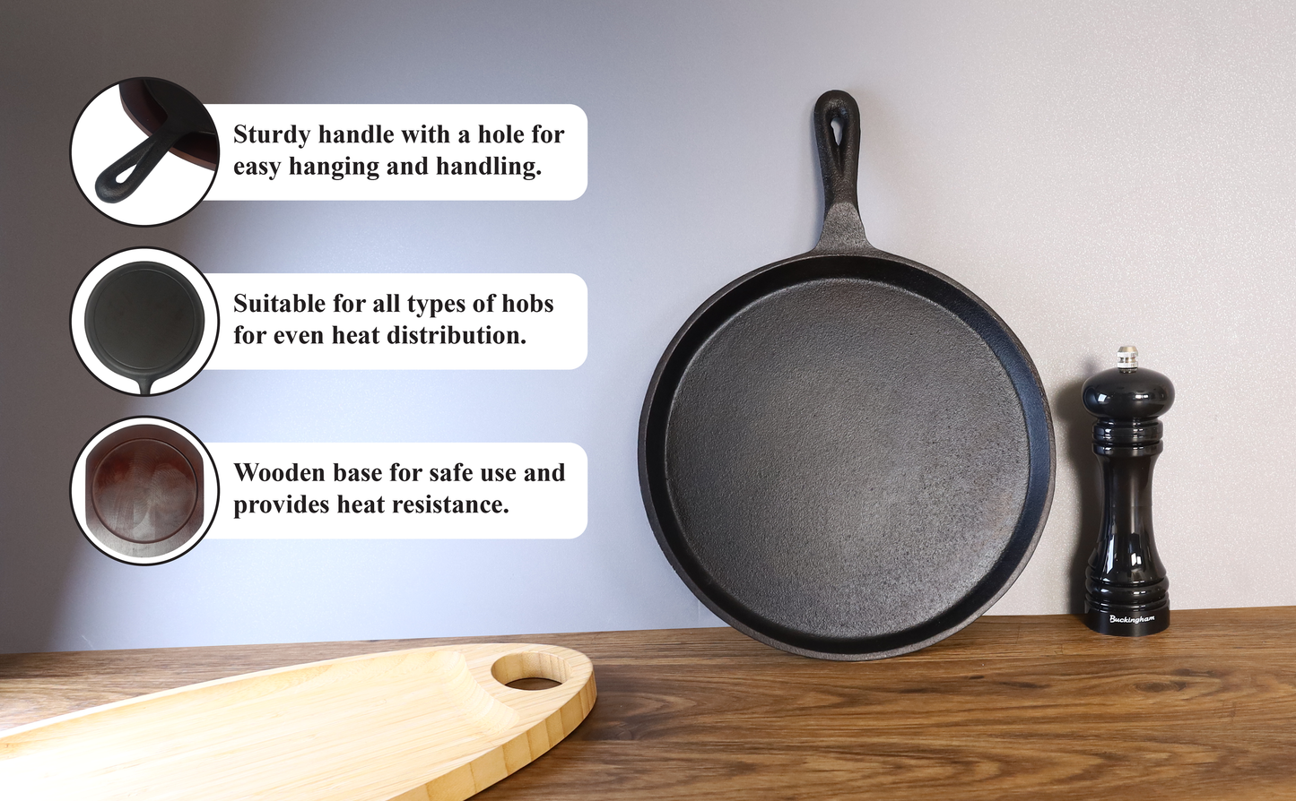 The Buckingham Cast Iron Crepe Pan with Wooden Base is a versatile and durable kitchen essential, ideal for making crepes, pancakes, flatbreads, and even sizzlers. With a 27 cm diameter and a pre-seasoned surface, this pan offers excellent heat distribution and retention for consistent, flavourful results. The natural non-stick surface improves with each use, while the included wooden base allows for stylish, heat-safe table serving.