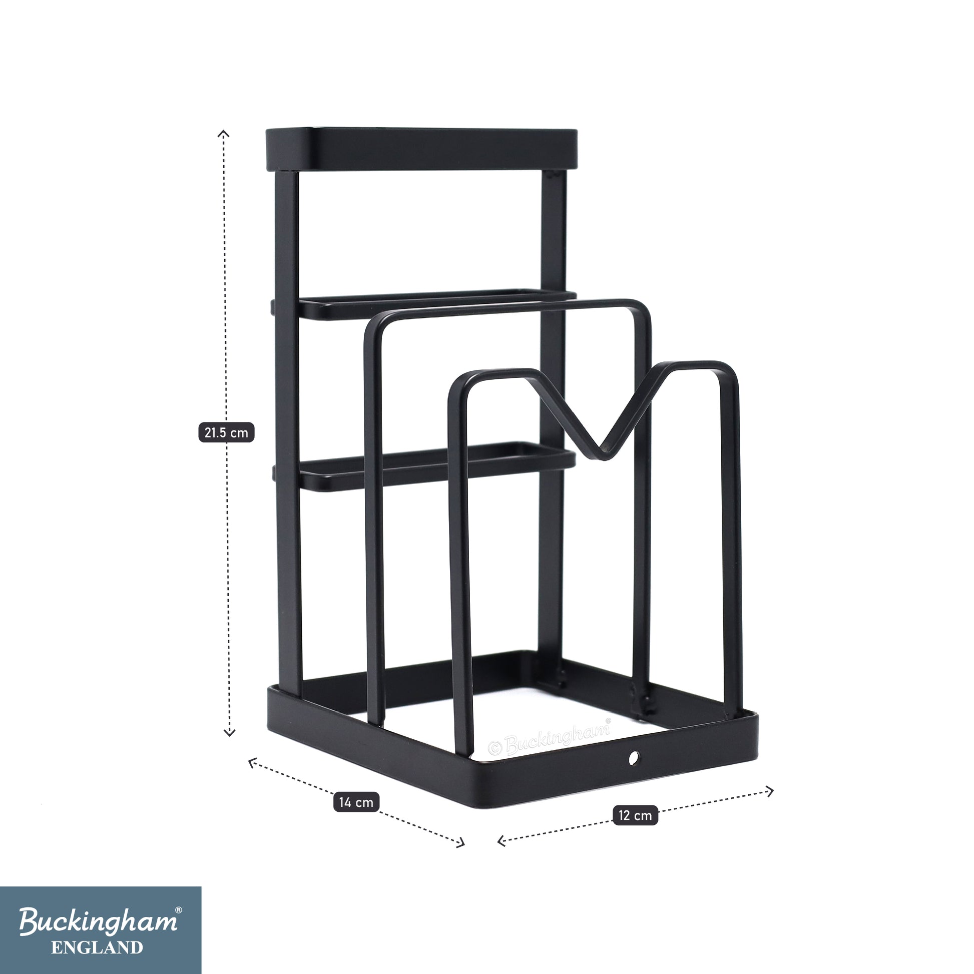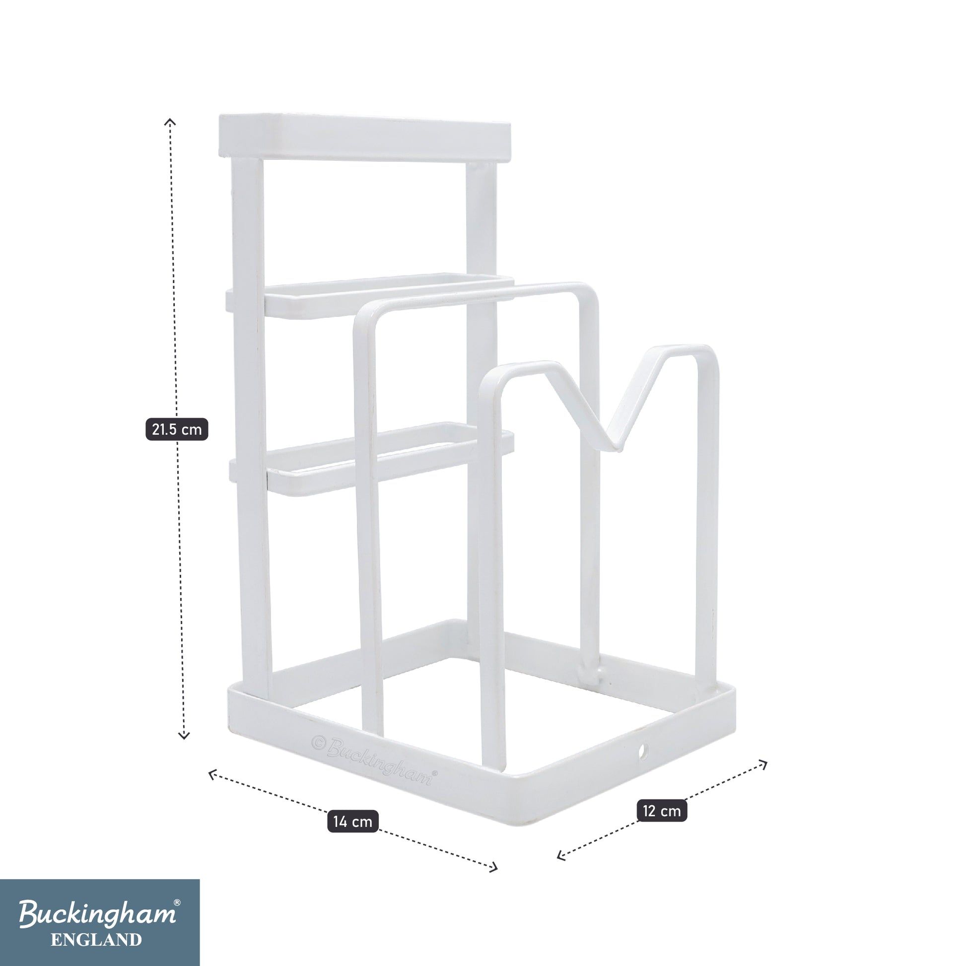 Buckingham kitchen organising rack is a premium, multi-purpose storage solution designed to bring order and style to your kitchen. Ideal for holding baking trays, chopping boards, pot lids, and knives, it keeps your essentials neatly arranged and easily accessible. Made from thick gauge iron metal with a durable powder-coated finish in elegant white or black, it combines modern aesthetics with long-lasting performance. Pre-assembled for immediate use, our rack fits effortlessly in cupboards or on countertops, helping you save space and maintain a clutter-free kitchen. Compact yet sturdy, it’s a perfect choice for maximizing functionality in any kitchen setup.