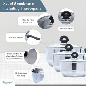 Buckingham Stainless Steel 5 Piece Pan Set Glass Lid with Bakelite Handle