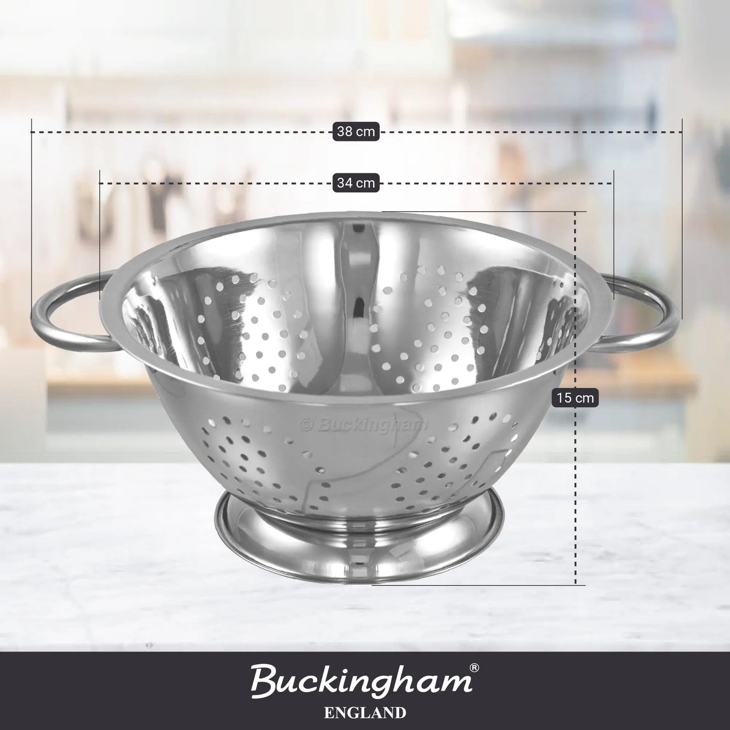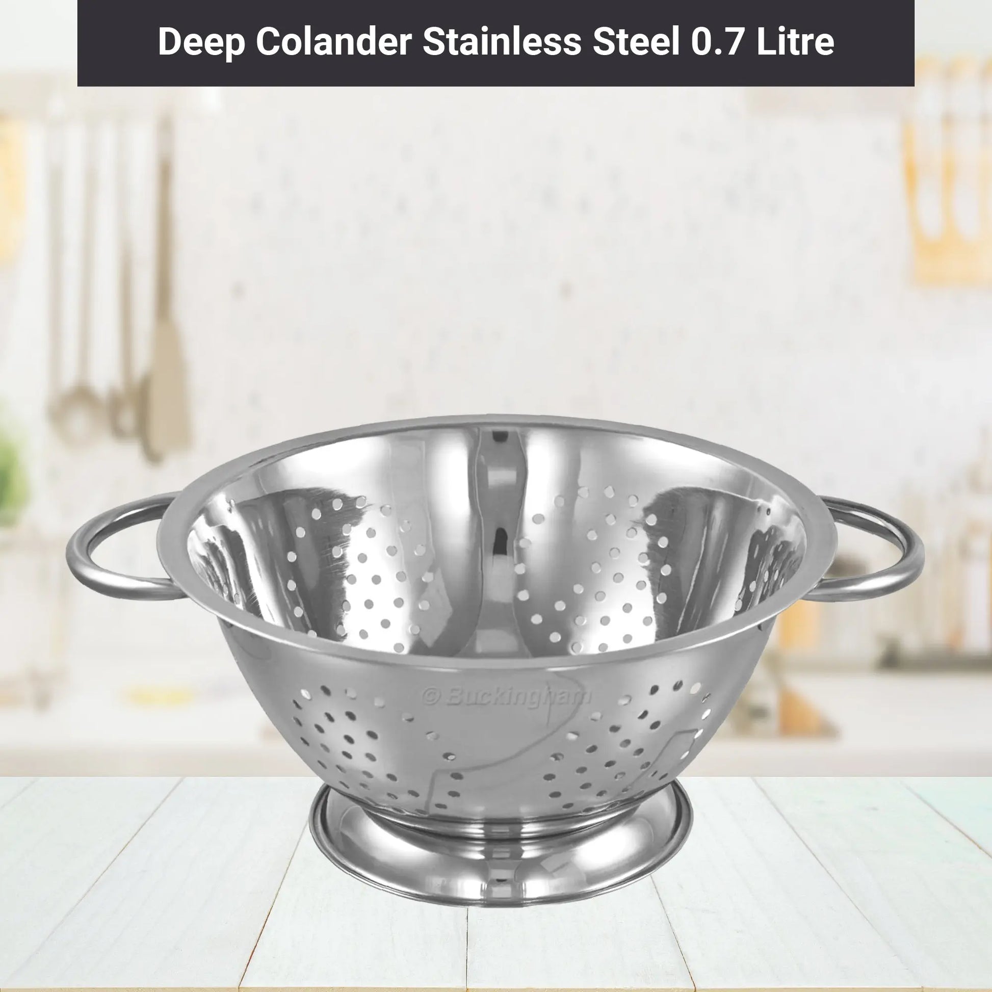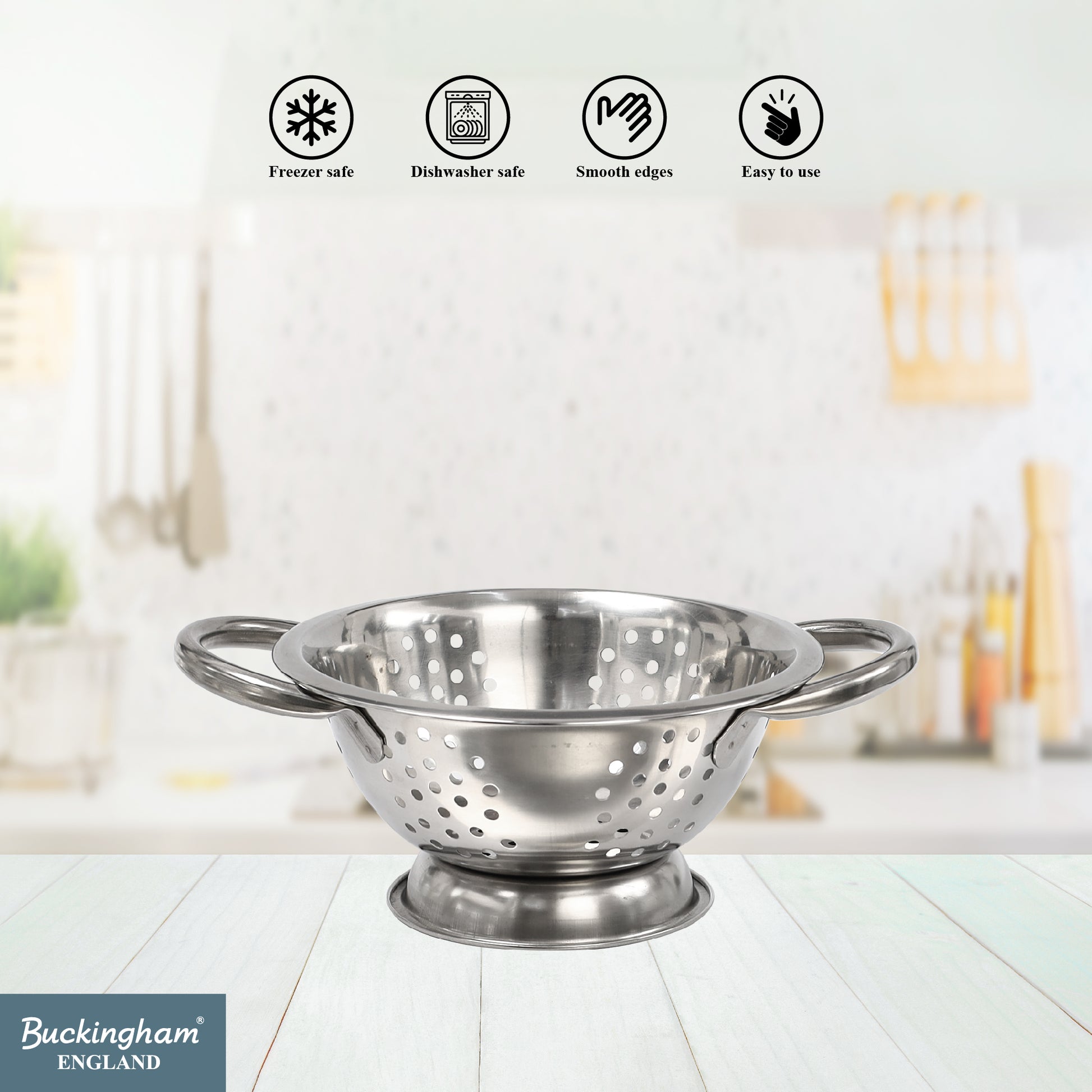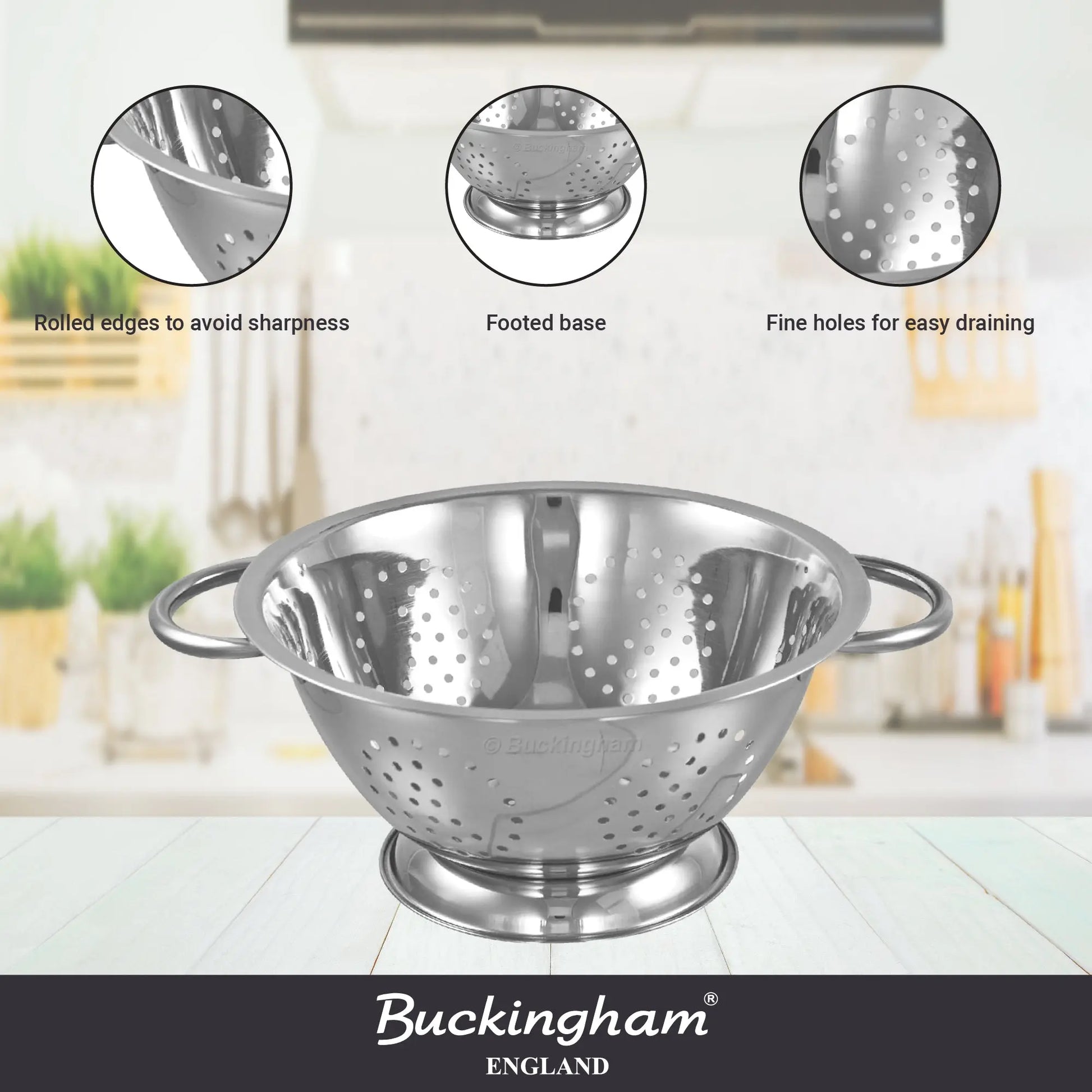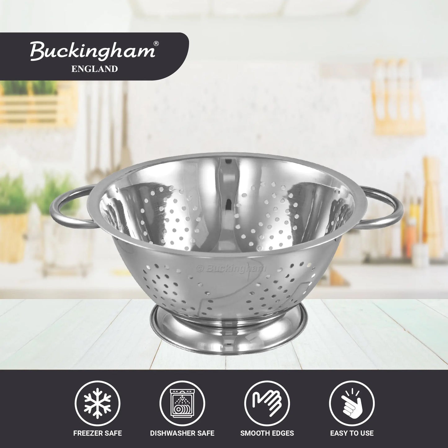 Buckingham Deep Colander is a compact yet versatile kitchen essential. Made from rust-resistant stainless steel with efficient perforations, a raised base, and ergonomic handles, it delivers quick draining, stability, and easy handling. Stylish and practical, it’s perfect for everyday food prep in any kitchen.