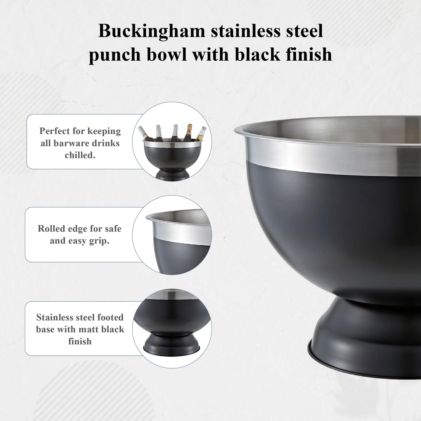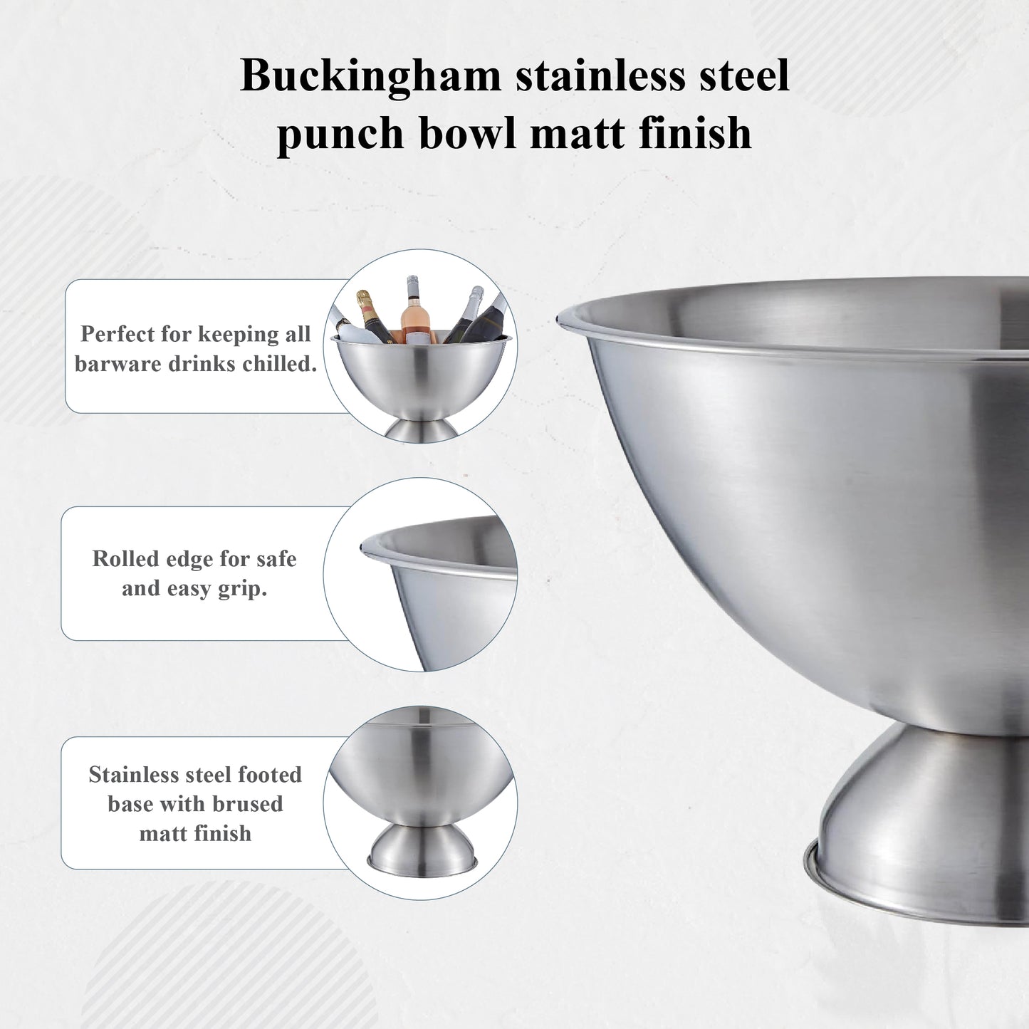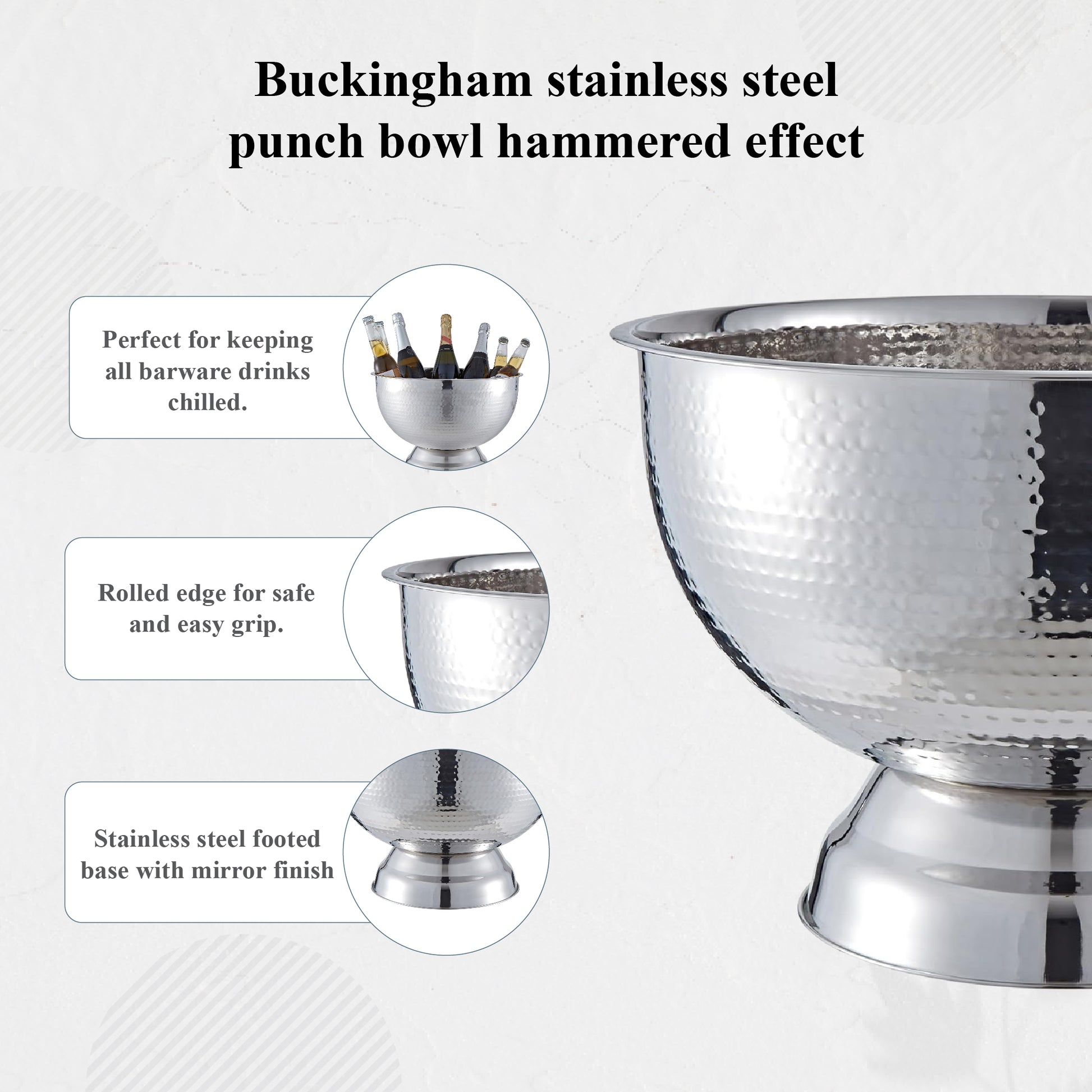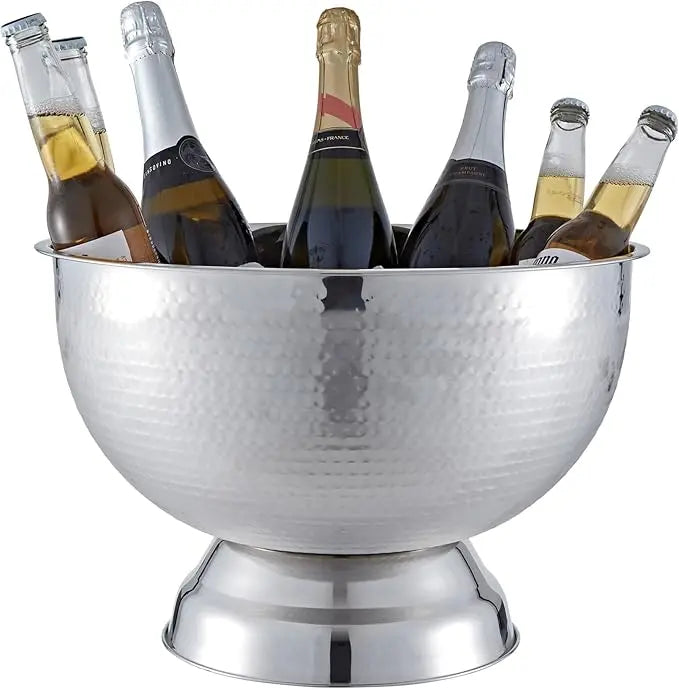 Designed for impressive entertaining, the Buckingham Large Punch Bowl & Wine Cooler combines elegance, durability, and versatility. With a generous 17.5L capacity, it easily chills multiple bottles or serves punch and salads, making it ideal for weddings, parties, and celebrations. Crafted from premium stainless steel with a polished, hammered finish, it offers a striking look for any setting.