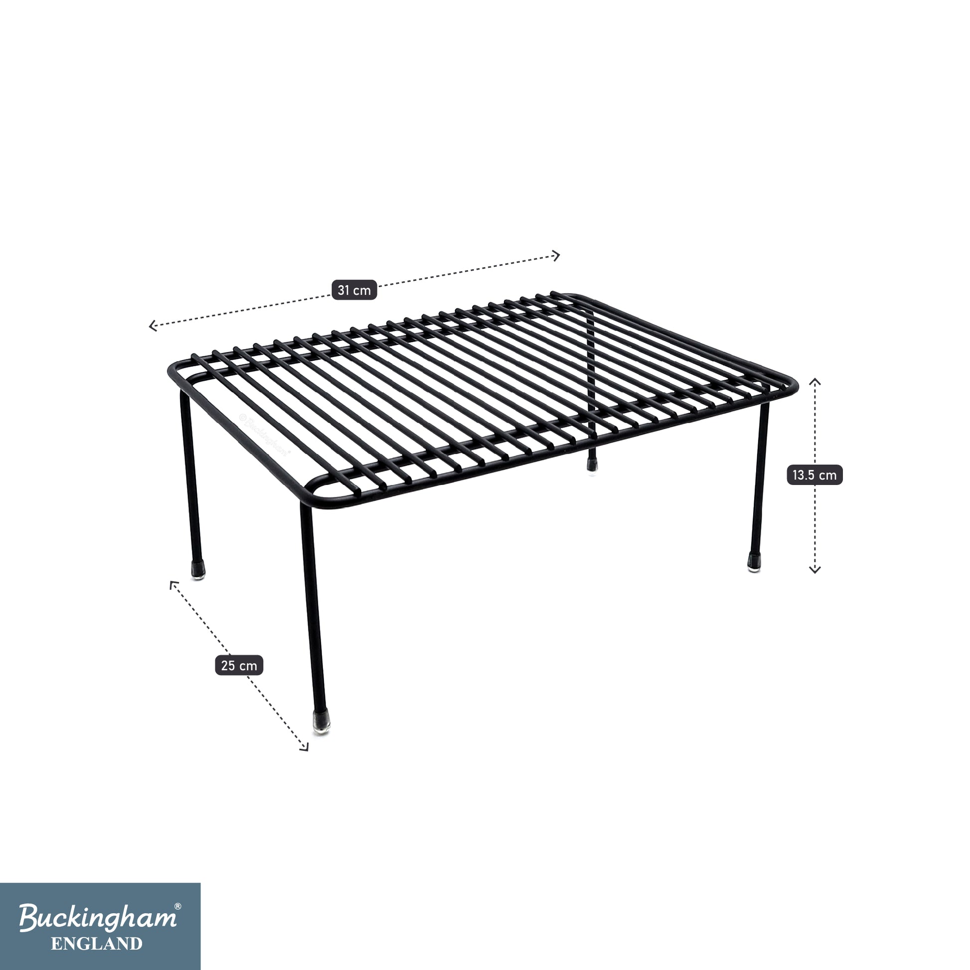 Buckingham premium helper shelf offers a perfect balance of elegance, strength and practicality. Made from thick-gauge iron wire with a sleek black powder-coated finish, it delivers superior durability and a refined modern look. Designed to maximize cupboard and countertop space, it’s perfect for organizing jars, mugs and other essentials while keeping your kitchen or pantry tidy. With its pre-assembled, ready-to-use design, our sturdy storage rack provides an effortless and space-efficient way to enhance organization in any home.