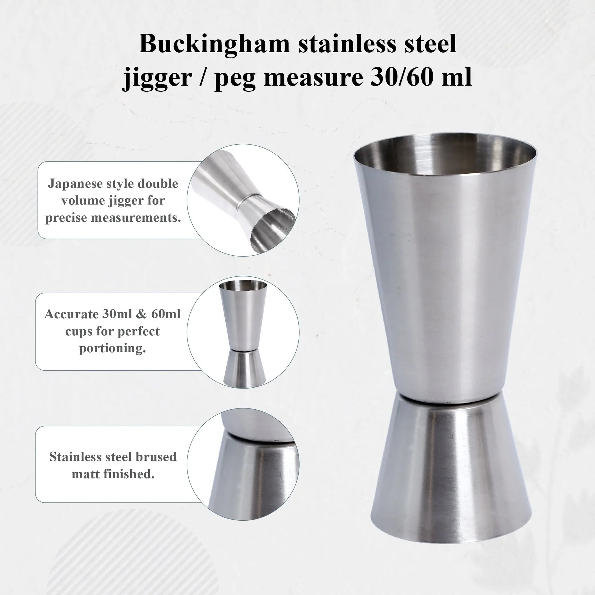 Buckingham Stainless Steel Jigger Peg Measure 30/60 ml, with our matt finish, is a sleek and practical tool for precise drink measurements, making it a must-have for any home bar or professional setting. Our double-sided jigger features two measurement capacities: 30 ml on one side and 60 ml on the other, catering to a variety of cocktail recipes or serving needs. Made from premium stainless steel, it is durable, rust-resistant and easy to clean. Our matt finish provides a modern, non-slip texture, ensuring a comfortable grip during use. Our compact and elegant design makes it an essential accessory for both amateur mixologists and professional bartenders.