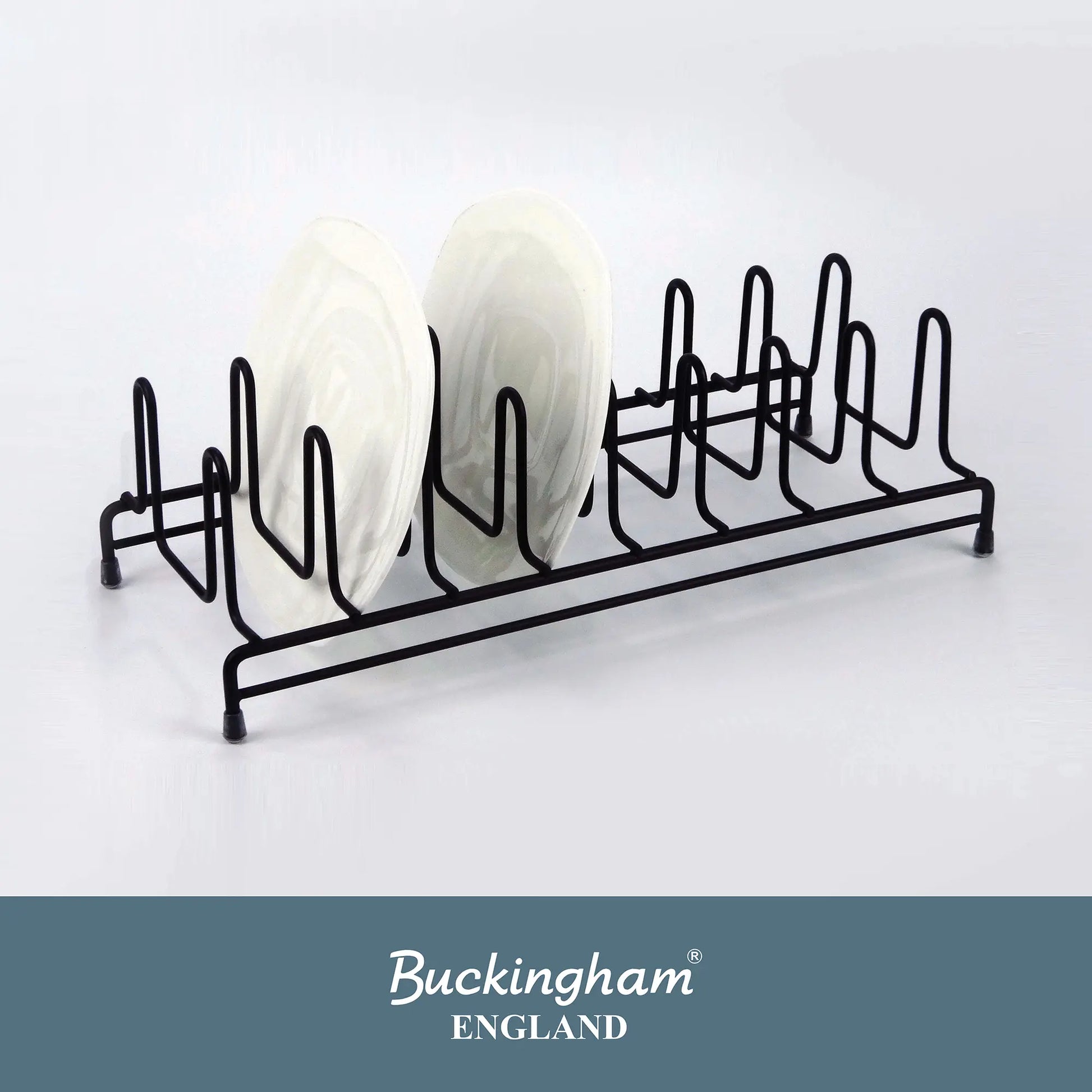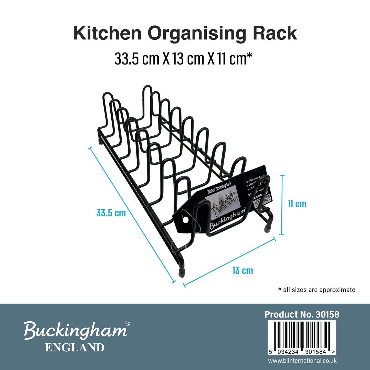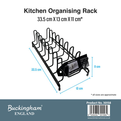 Buckingham Premium Kitchen Organising Rack offers a durable and stylish solution for decluttering your kitchen. Made from strong iron wire with a sleek black powder-coated finish, it resists rust and wear while enhancing any décor. Compact yet spacious (33.5 × 13× 11 cm), it neatly stores plates, lids or boards and comes pre-assembled for immediate use, perfect for keeping your kitchen organized with modern elegance.