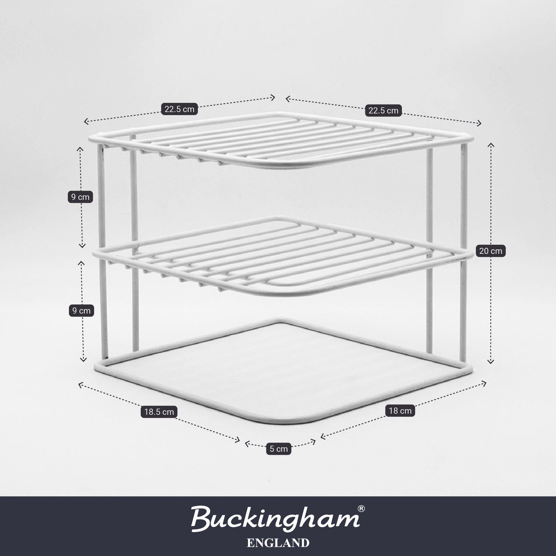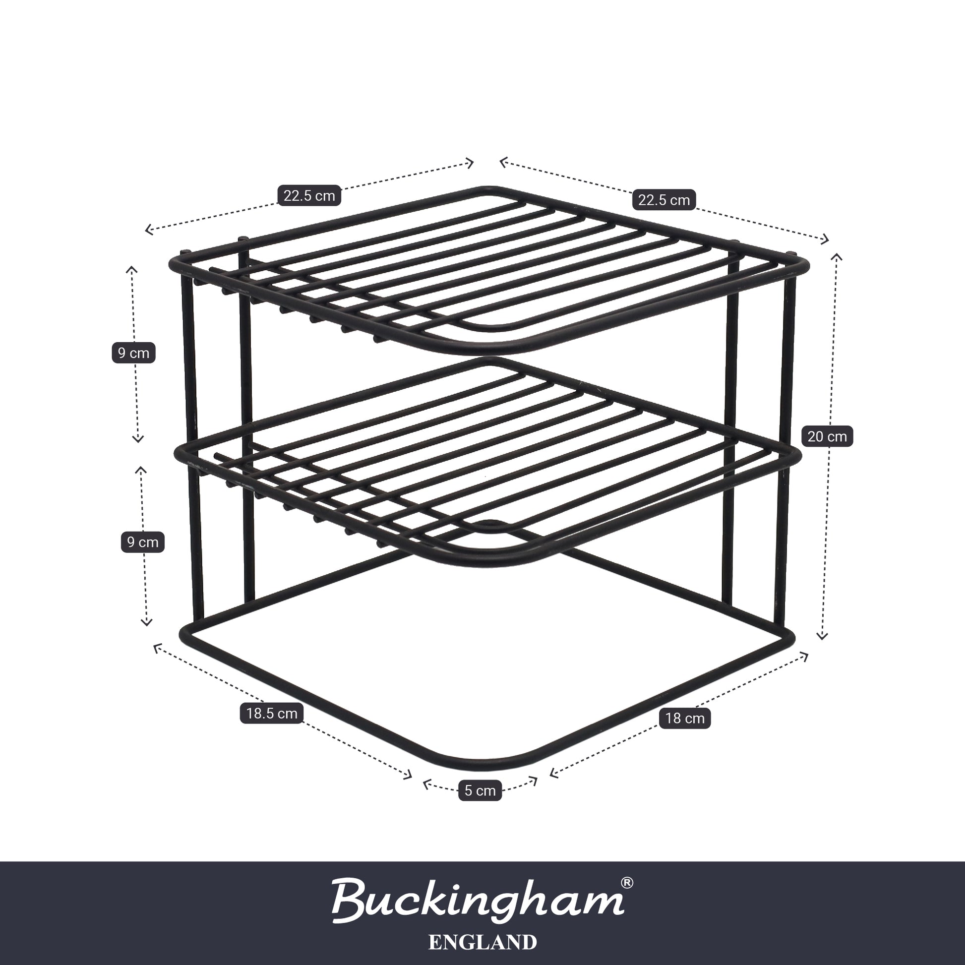 Buckingham premium 3-tier corner plate kitchen cupboard organiser is designed to make the most of your cupboard space while keeping your kitchen tidy and efficient. Our corner-friendly design utilizes unused areas, offering three sturdy tiers for plates, bowls, and other essentials. Made from thick gauge iron wire with a durable black coating and chrome-plated finish, it ensures long-lasting use and rust resistance. With its elegant modern look and pre-assembled convenience, our compact organiser 22.5 cm x 22.5 cm x 20 cm is the perfect blend of durability, style and functionality for any kitchen.