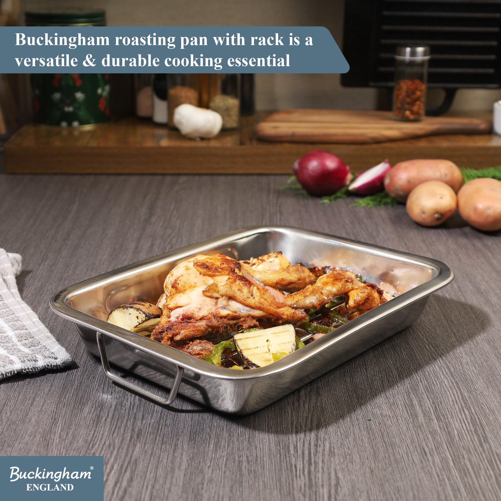 Buckingham Stainless Steel Roasting Pan with Rack is a versatile and durable cooking essential, designed for efficient and healthy roasting. Made from premium-quality stainless steel, the pan is resistant to rust and corrosion, ensuring long-term reliability and a polished aesthetic. Its removable rack raises meat above the base, enabling air circulation and fat drainage for evenly cooked and healthier results. The pan is compatible with all heat sources except induction and is oven, freezer, and dishwasher safe, providing flexibility and convenience. It is compact yet practical, perfect for large and small-scale roasting tasks. Easy to clean and maintain, this roasting pan is a must-have for any home chef or cooking enthusiast.