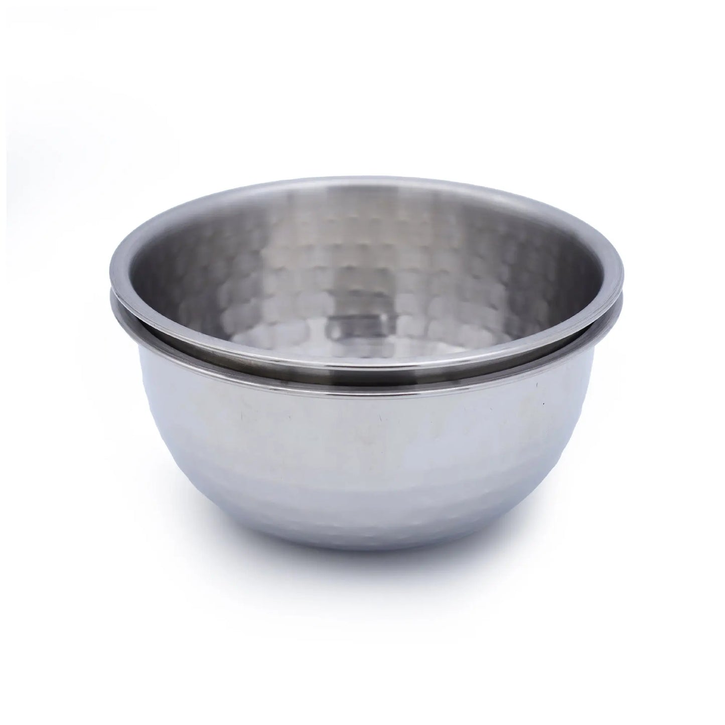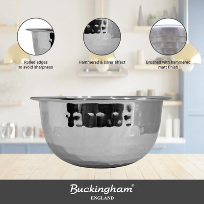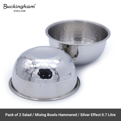 Buckingham Pack of 2 Salad/Mixing Bowls (0.7L, 14 cm) combines durability, versatility, and timeless style. Made from premium stainless steel, they resist rust and corrosion for long-lasting use. Our hammered exterior adds elegance and a slip-resistant grip, while their compact, stackable design saves cabinet space. Perfect for mixing, prepping, or serving small portions, our bowls are easy to wash and maintain their polished shine, making them a practical and stylish addition to any kitchen.