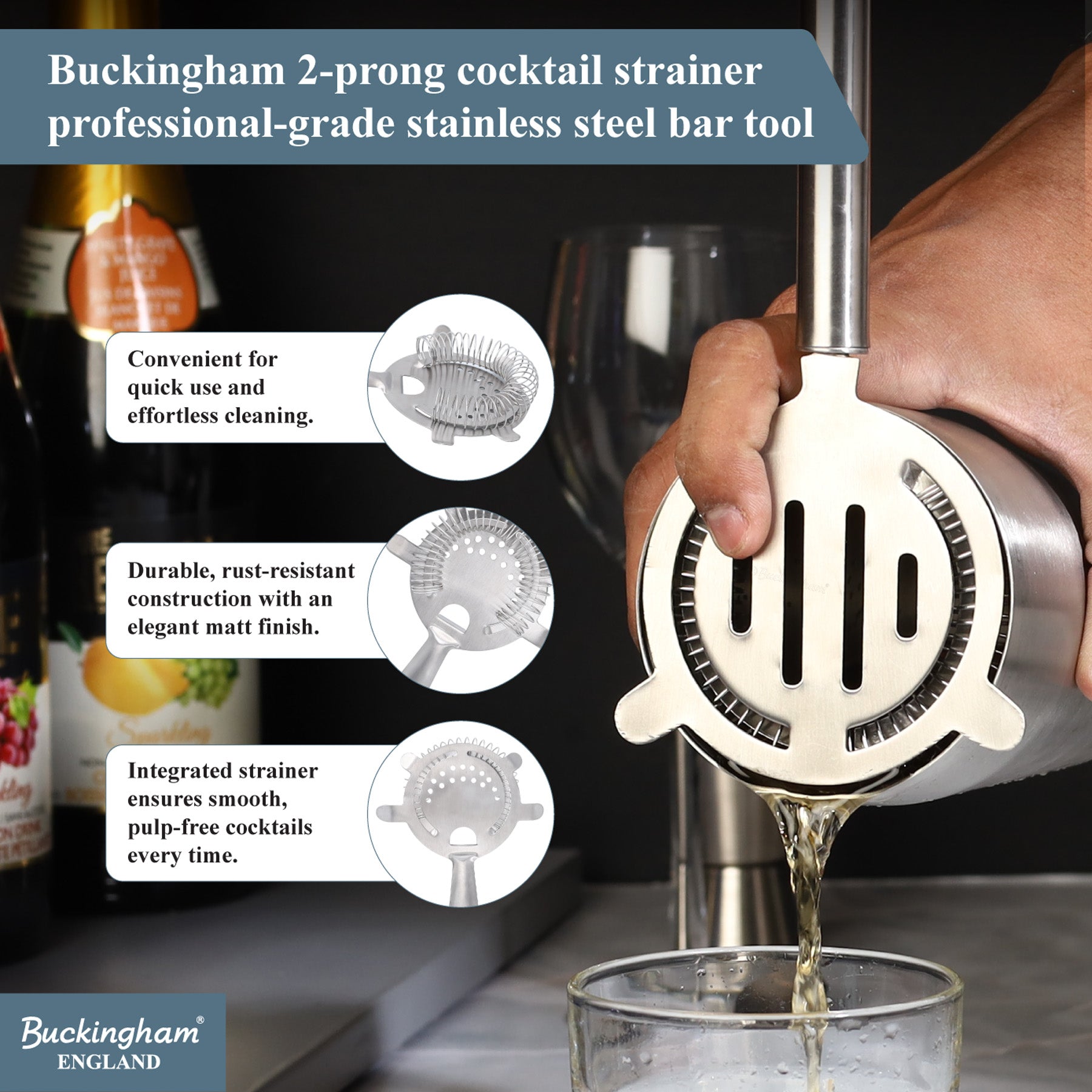 Buckingham 4-Prong Hawthorne Cocktail Strainer delivers professional-quality results with every pour. Built from robust stainless steel, it combines durability with a sleek, polished look that resists rust over time. Our four-prong structure offers a secure, stable fit on various shakers and mixing glasses, while our compact size makes it adaptable for any style of cocktail preparation. Our tightly coiled spring ensures precise straining, removing ice, pulp and seeds for an ultra-smooth finish. Designed for comfort and convenience, the ergonomic handle provides excellent control and the dishwasher-safe construction makes cleaning effortless, an essential tool for both bartenders and home mixologists.